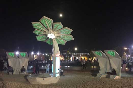 وتم تجهيز الألواح الشمسية على سقف الشجرة الذكية لامتصاص أشعة الشمس بشكل كامل نهارا وإطلاق الطاقة المخزنة ليلا، وتتميز سرعة الشحن لأشجار النخيل الذكية بسرعة أكبر من الشاحن العادي.