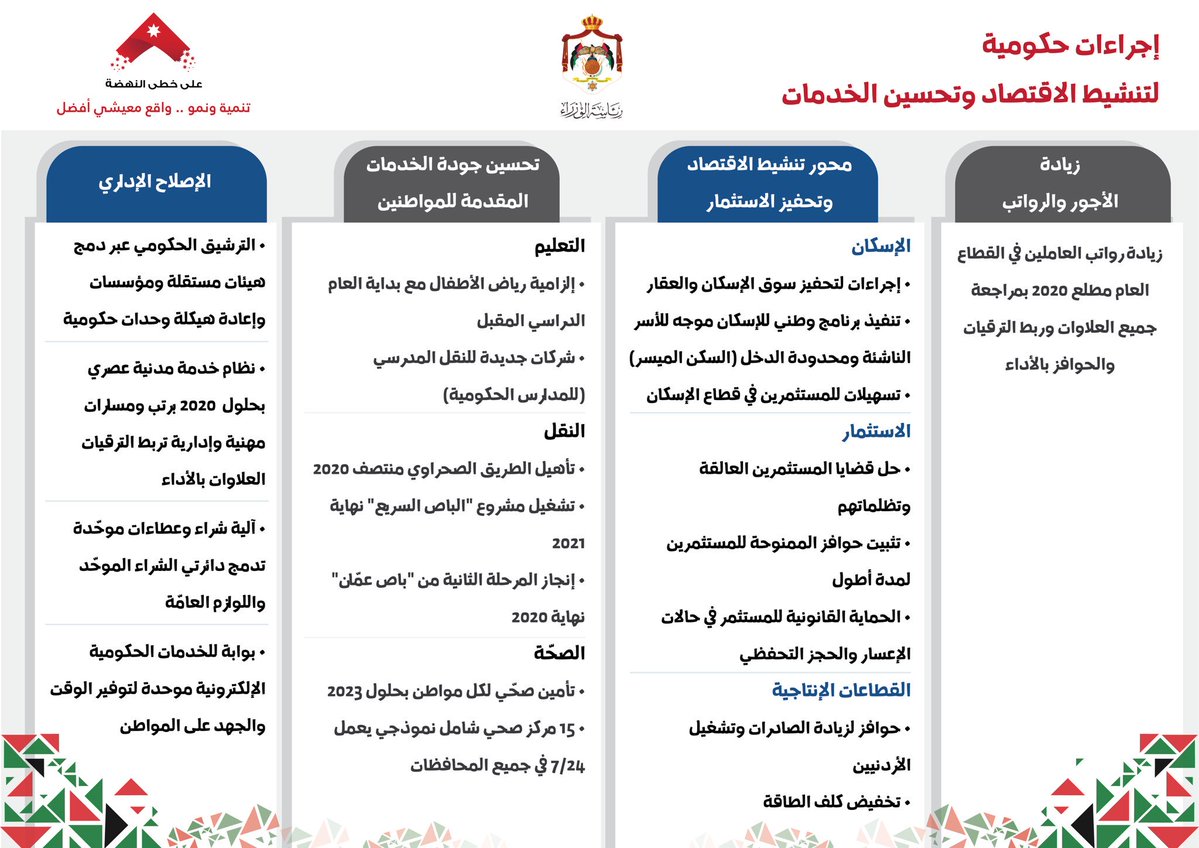 المستقلة / نشرت رئاسة الوزراء، عدة اجراءات حكومية جديدة ، كانت قد أقرتها مؤخراً لتنشيط الاقتصاد في الأردن.